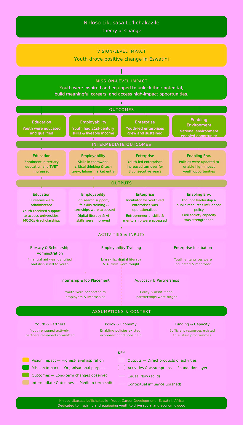 Nhloso Likusasa Le’lichakazile is a nonprofit organisation focused on transforming the future of Eswatini youth. We believe that by equipping young people with relevant skills and access to opportunities, we can empower them to create brighter futures for themselves and their families, while contributing to the development of thriving communities and a stronger Eswatini.
